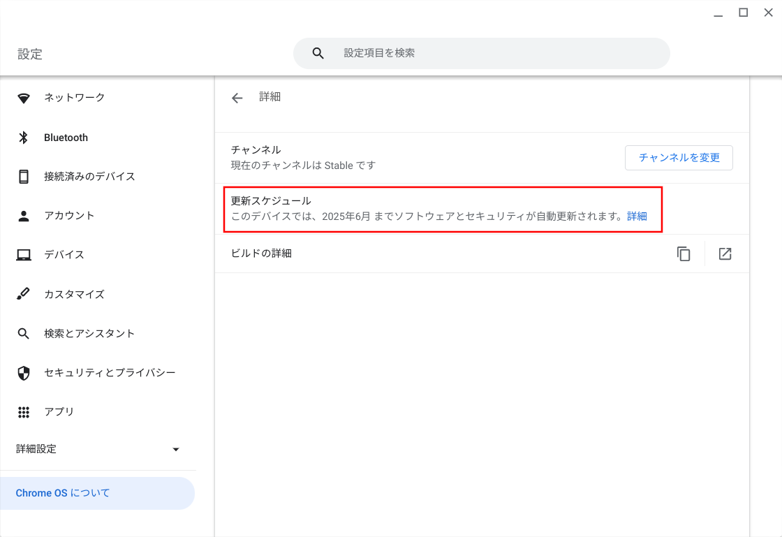 以上、Chromebook(Chrome OS)の自動更新サポート期限の確認手順でした。